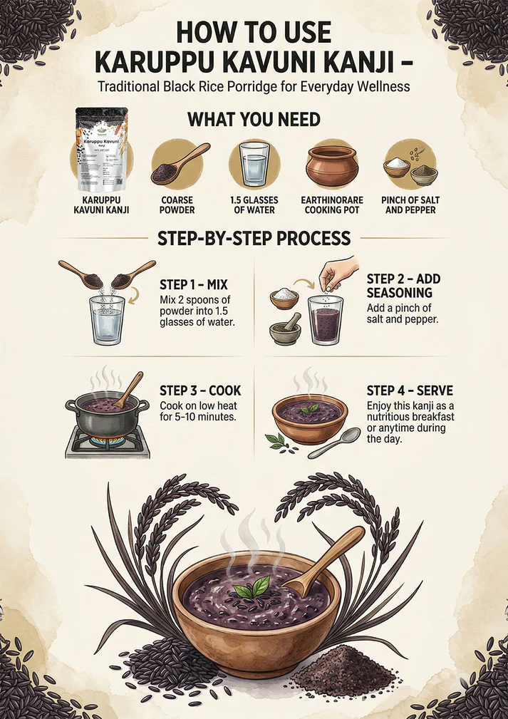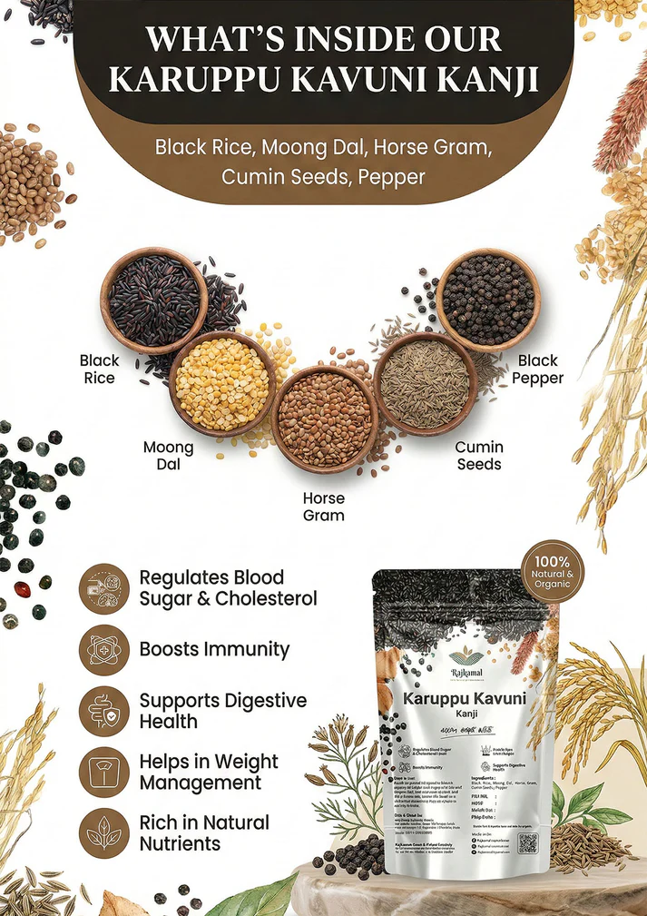 Karuppu Kavuni Kanji is a traditional Tamil health mix made from nutrient-rich black rice blended with carefully selected pulses and spices.