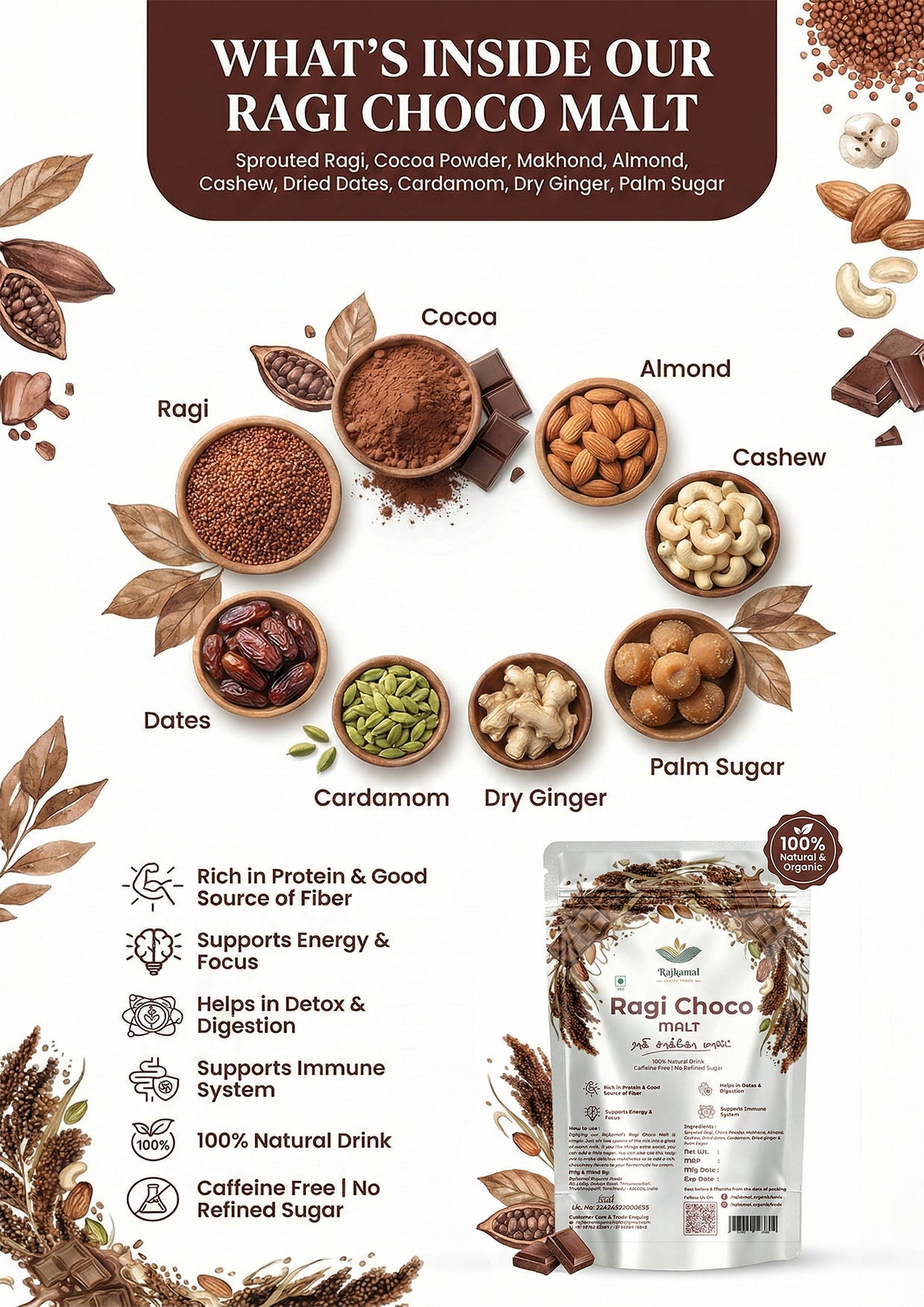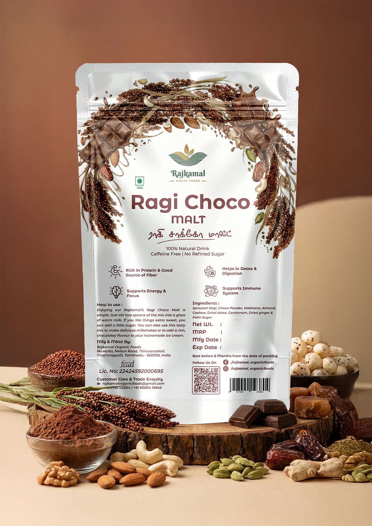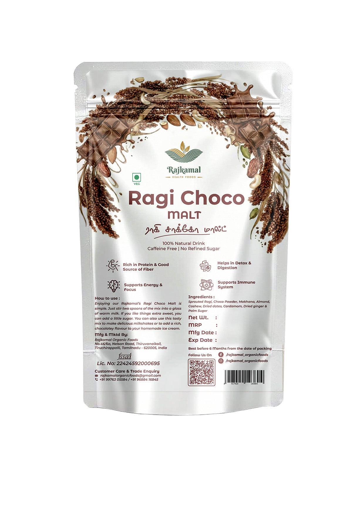 Ragi is naturally rich in calcium, iron, fibre, and essential minerals, helping support strong bones, healthy digestion, and sustained energy. When combined with the delightful taste of chocolate, this malt becomes a nutritious drink that can be enjoyed at any time of the day.