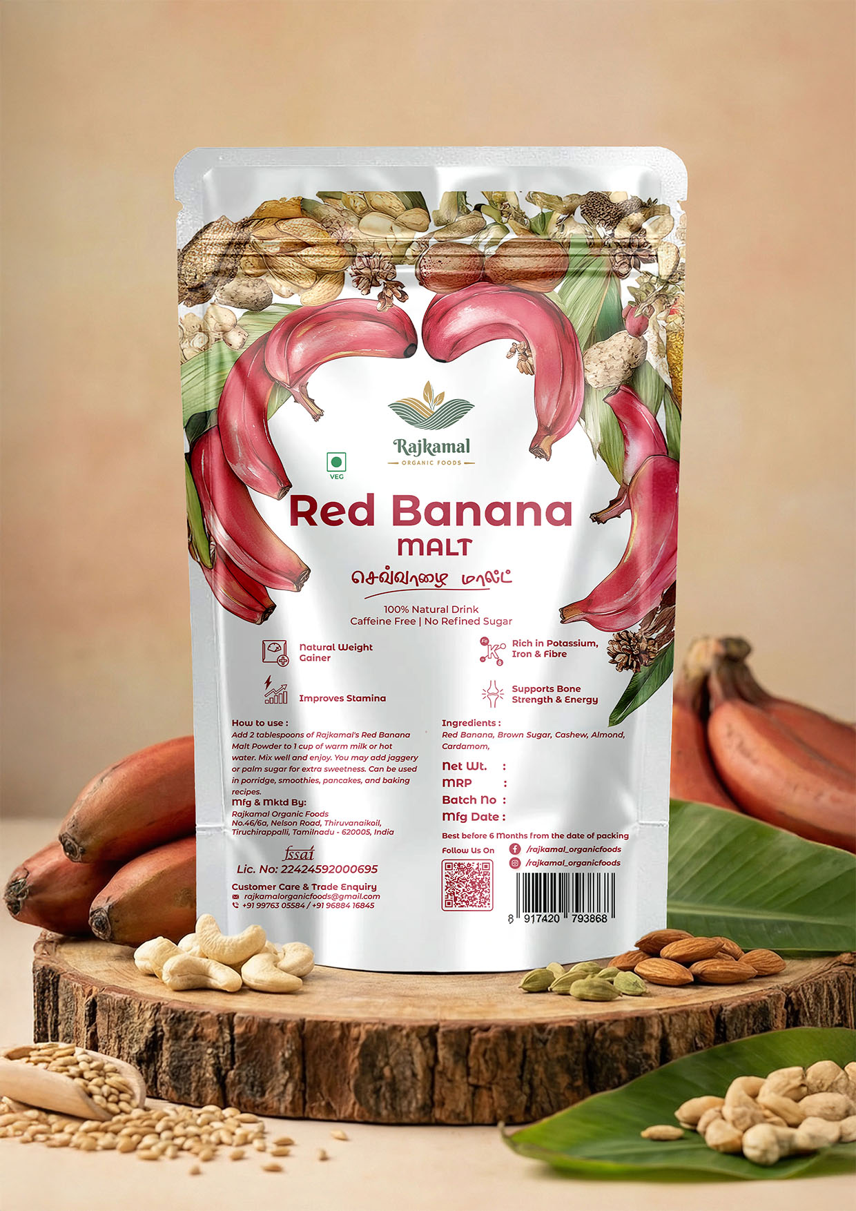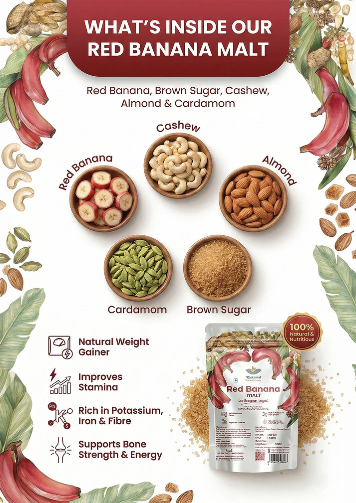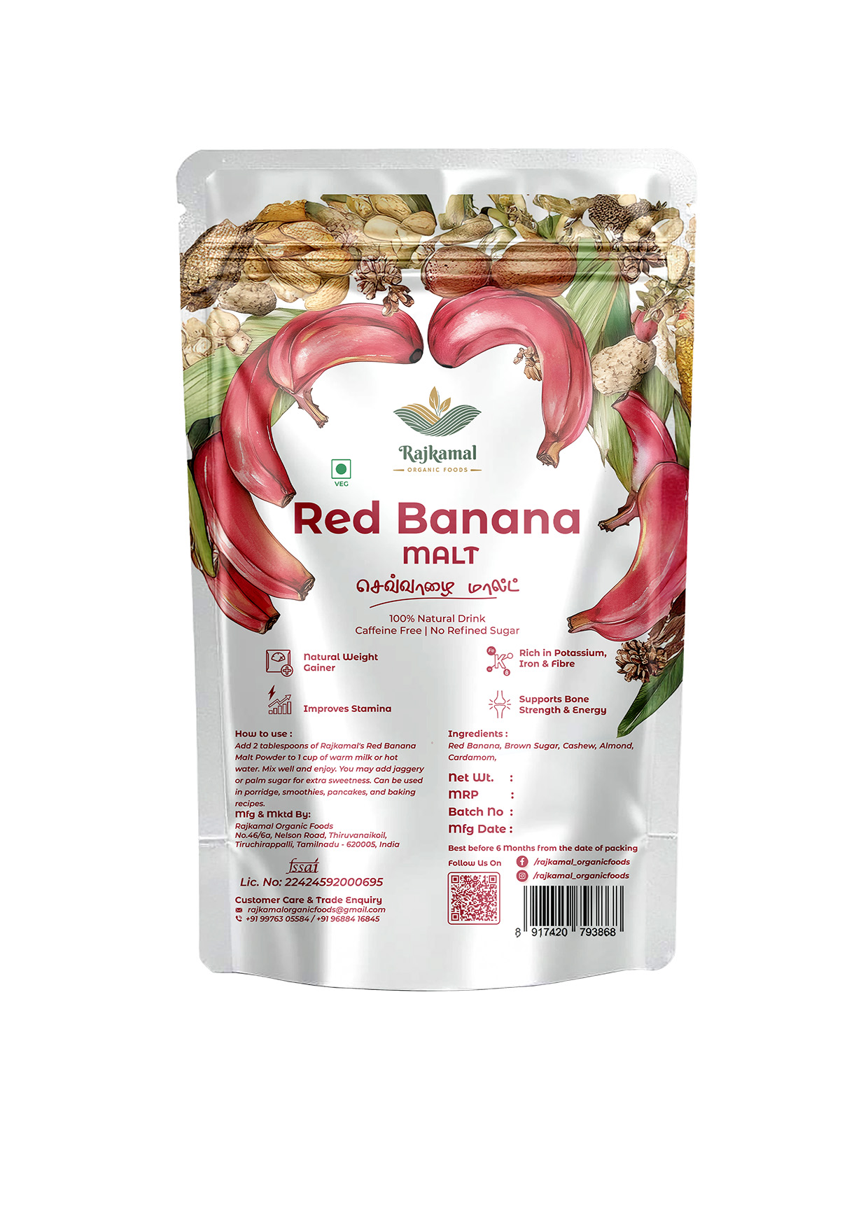 Rajkamal Red Banana Malt is a wholesome health drink mix made from carefully selected red bananas blended with almonds, cashews, cardamom, and natural brown sugar.