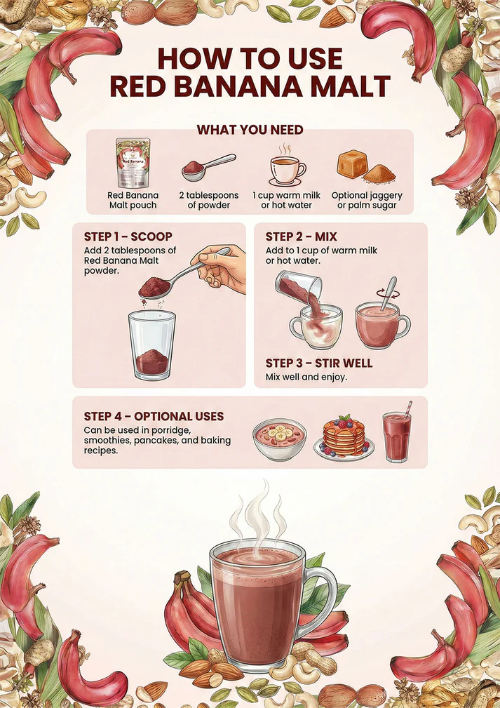 Add 1–2 teaspoons of Red Banana Malt to warm milk or warm water.