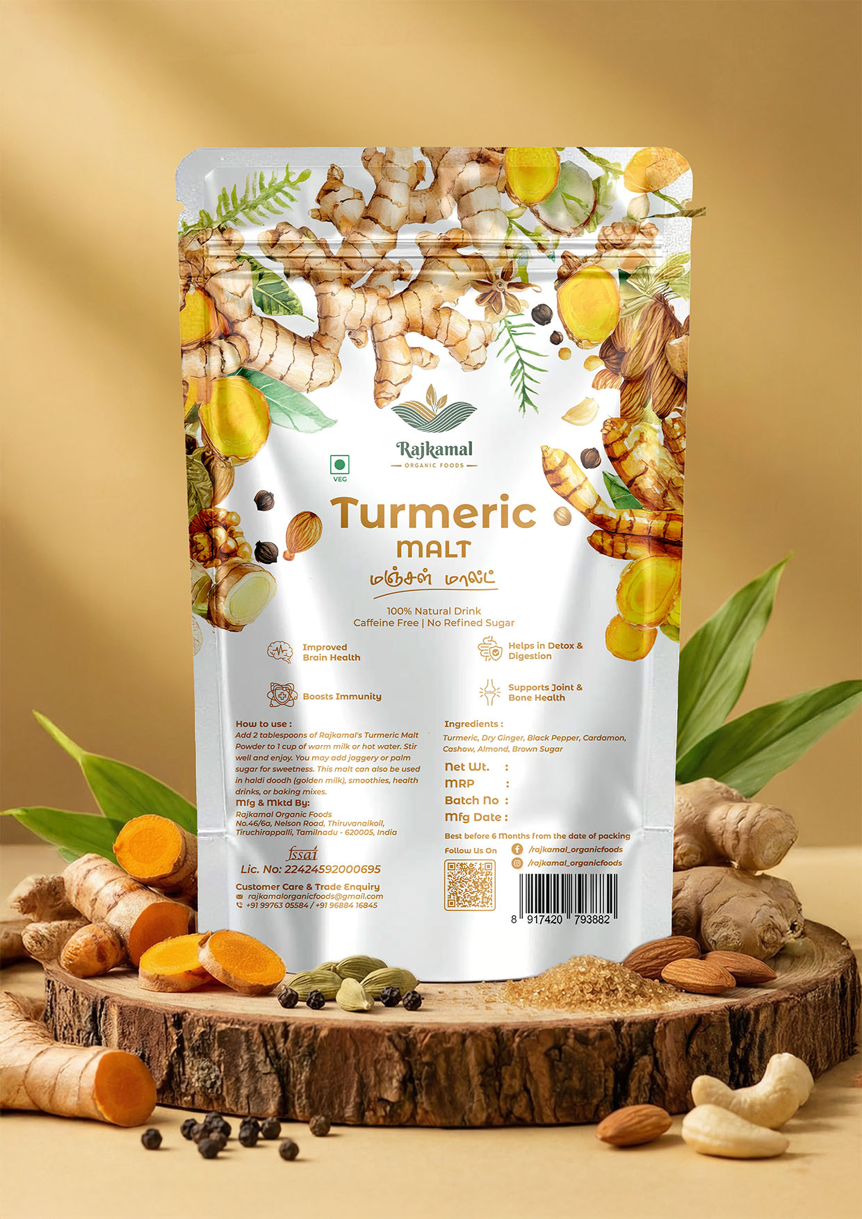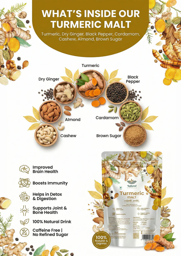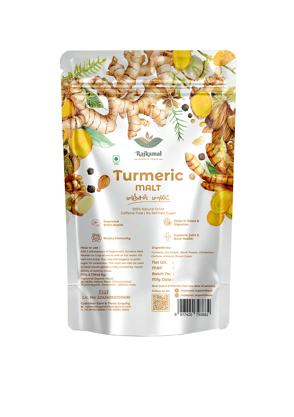 Rajkamal Turmeric Malt is a carefully blended health drink mix made from turmeric, dry ginger, black pepper, cardamom, and premium nuts.